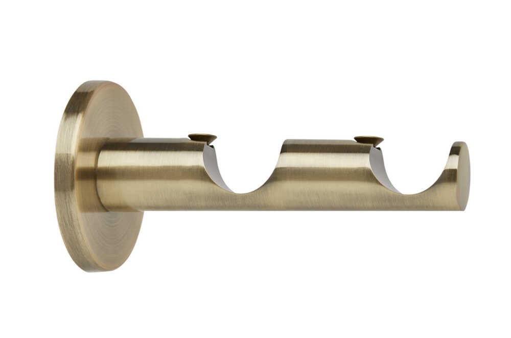 The Rolls Neo 28mm double curtain pole bracket in a spun brass finish is designed to support two 28mm diameter curtain poles, making it ideal for double curtain setups such as sheer and blackout combinations.