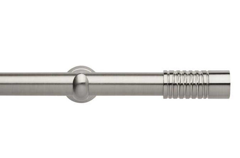 The Rolls Neo 28mm Wired Barrel Eyelet Metal Curtain Pole in Stainless Steel is a sleek and contemporary solution, designed specifically for use with eyelet curtains. Featuring a straight metal pole with distinctive wired barrel finials, this curtain pole introduces a subtle textured detail while maintaining a clean and modern look. The brushed stainless steel finish offers a soft metallic tone, making it a versatile choice for both contemporary and classic interiors.