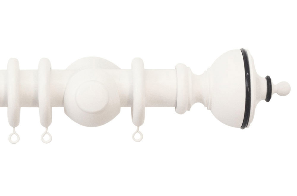 Combining traditional craftsmanship with a soft painted finish, the Jones Cathedral range in Cotton with Exeter finials is ideal for creating a light and coordinated window dressing scheme in living rooms, bedrooms, and dining spaces.